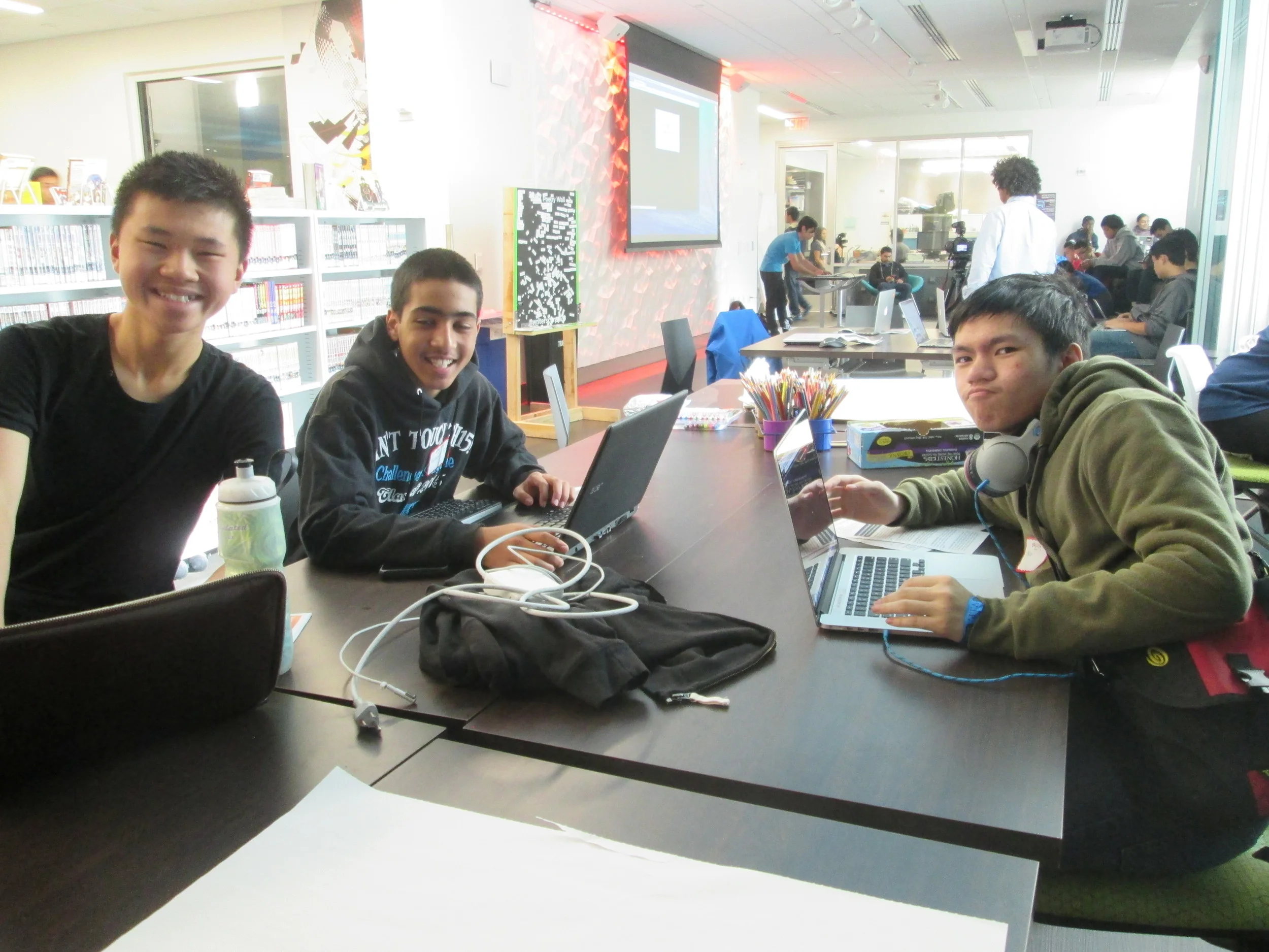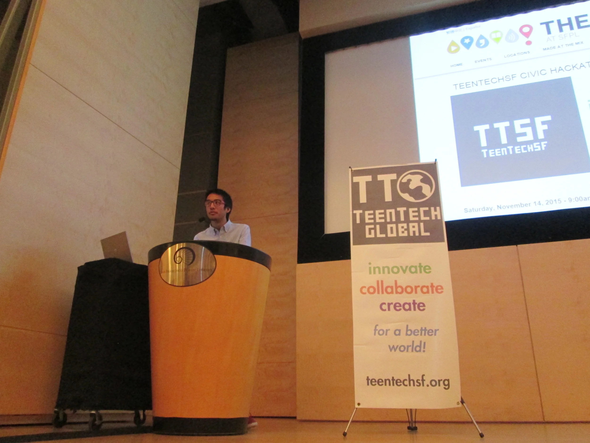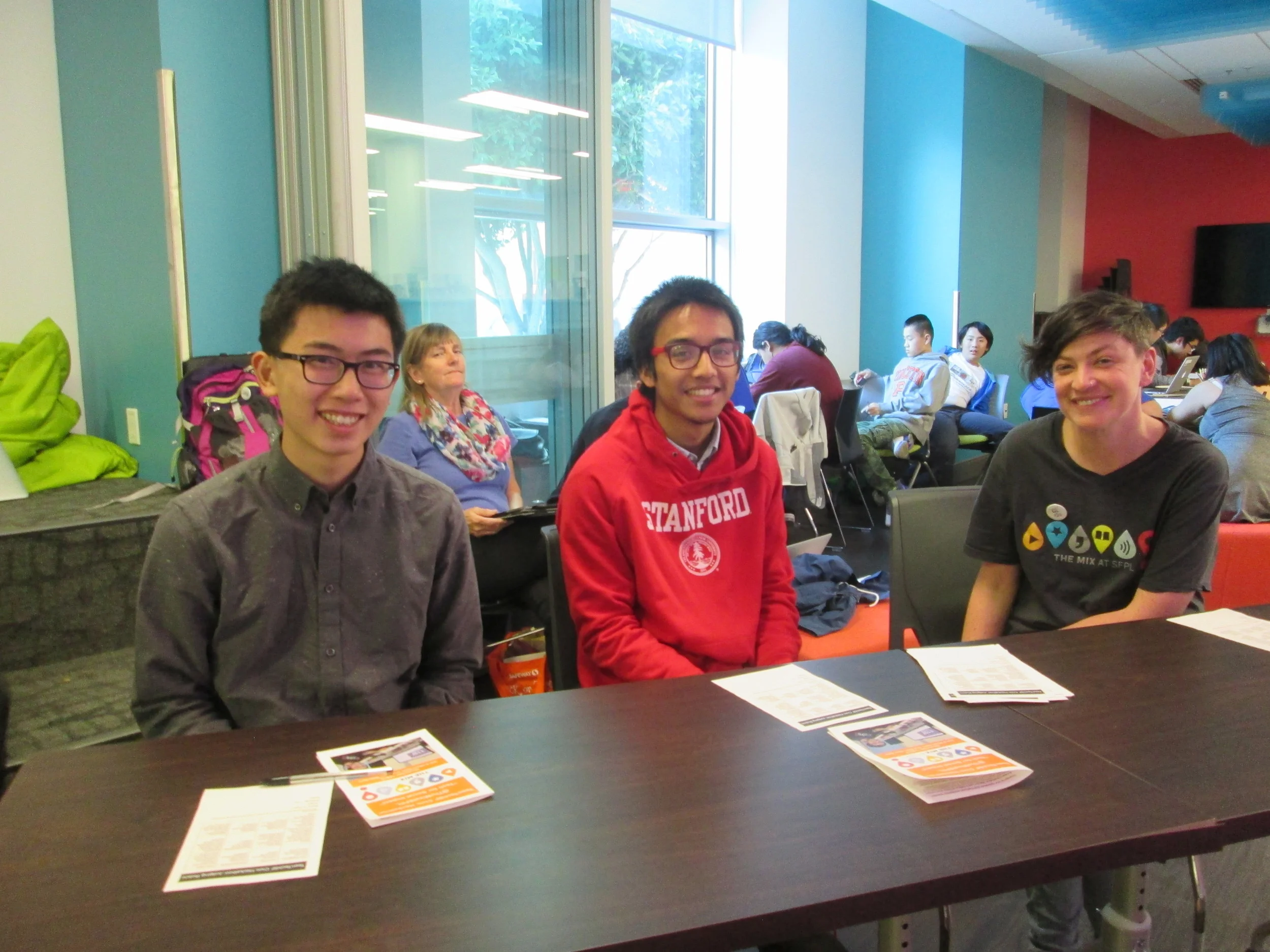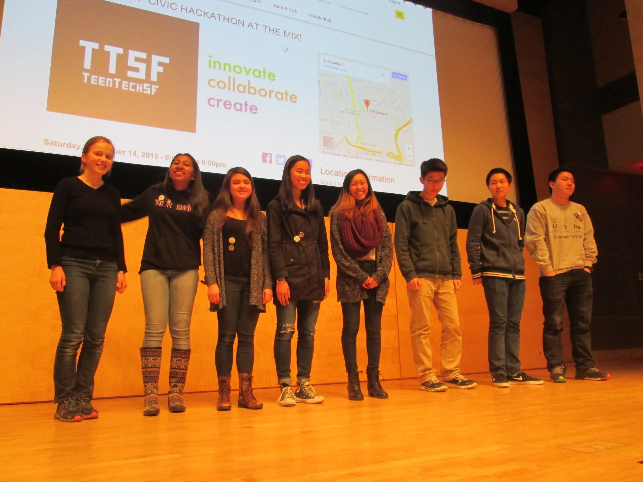 Nov 14&15, 2015: TeenTechSF organized the Bay Area's first student-led Civic Hackathon at The Mix at SFPL, San Francisco's new student-designed Digital Resource Center & Maker Space! An at-capacity crowd of 100+ students, mentors, speakers, workshop leaders, and volunteer organizers joined together to develop tech solutions to civic problems such as homelessness, hunger, educational reform, peer pressure, and community-building.