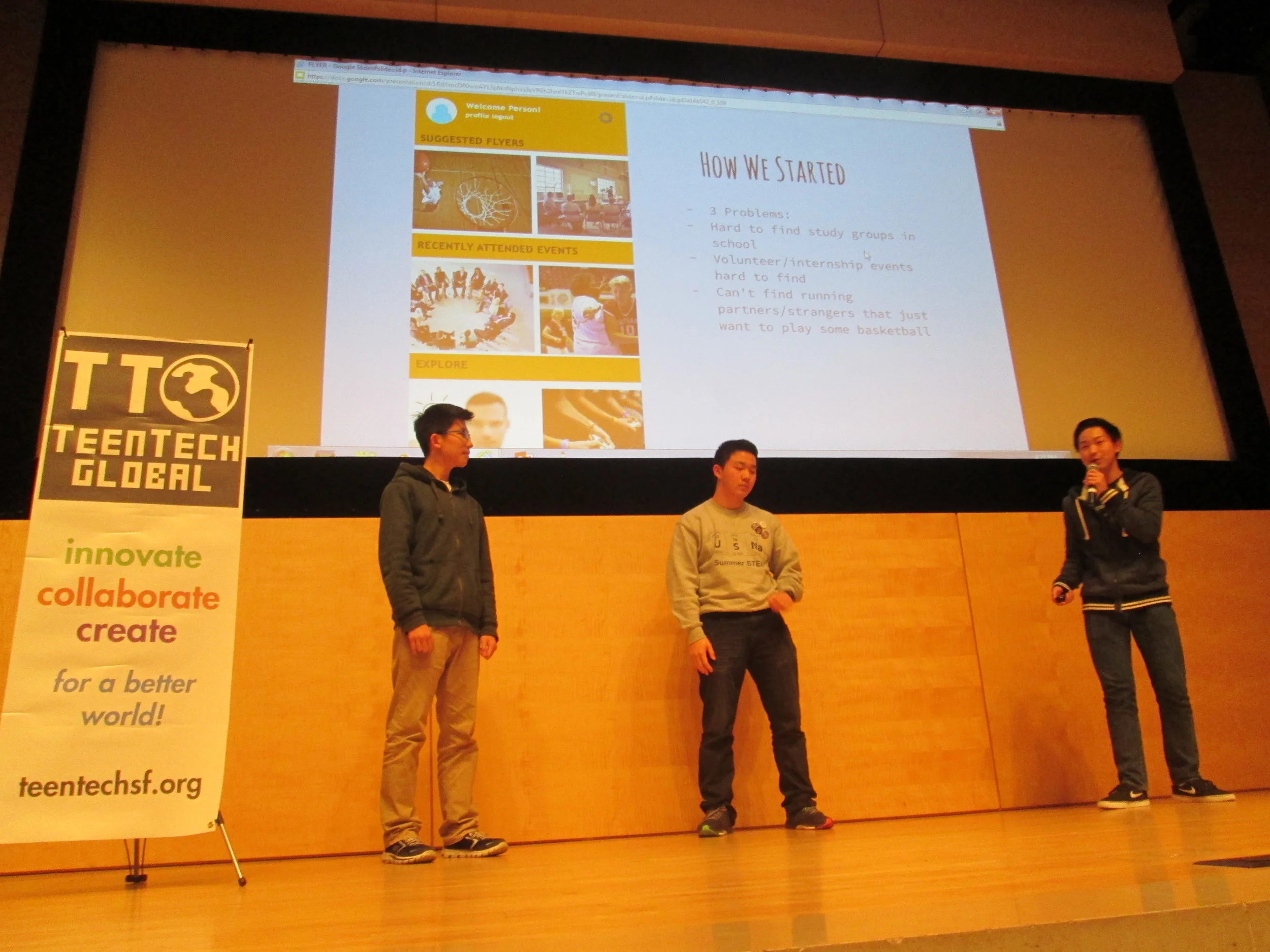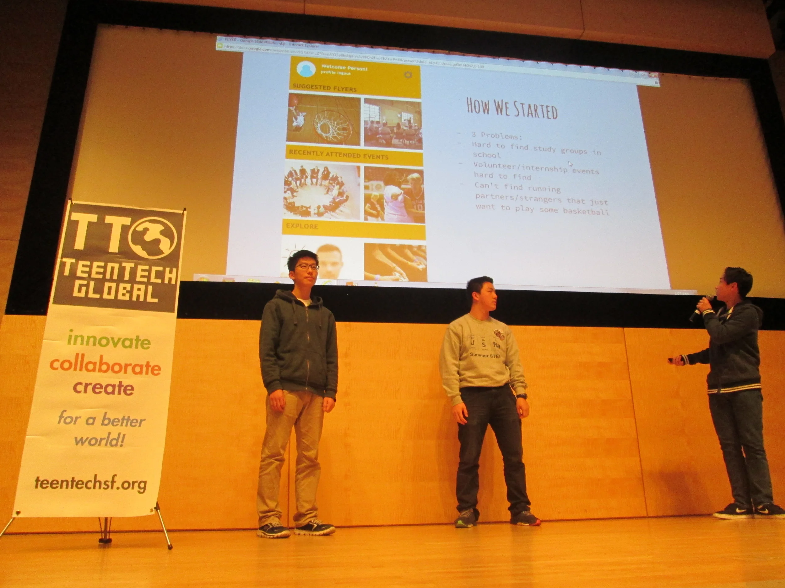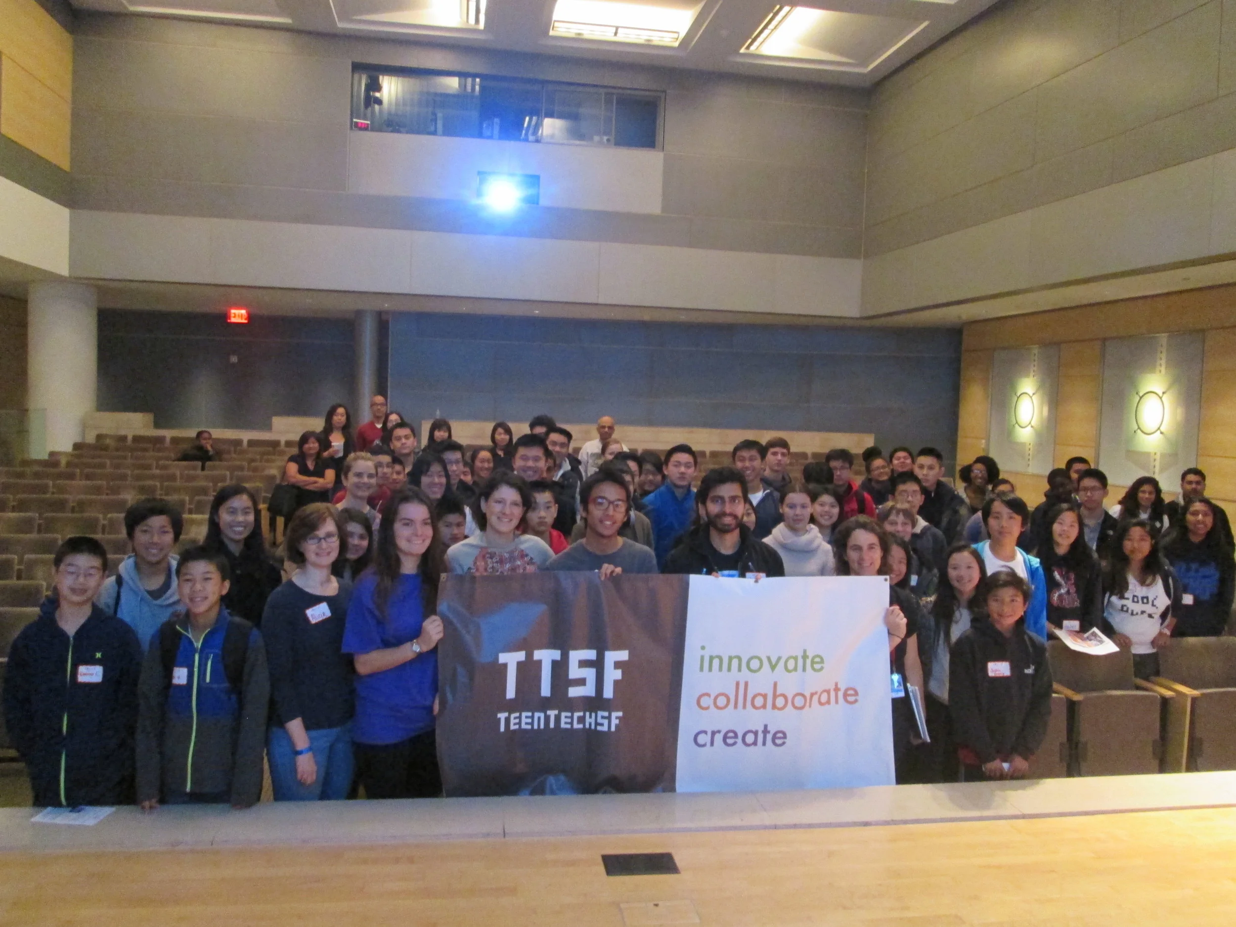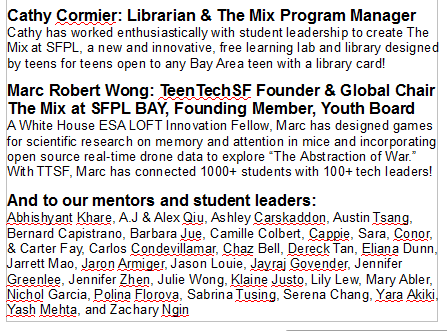 Nov 14&15, 2015: TeenTechSF organized the Bay Area's first student-led Civic Hackathon at The Mix at SFPL, San Francisco's new student-designed Digital Resource Center & Maker Space! An at-capacity crowd of 100+ students, mentors, speakers, workshop leaders, and volunteer organizers joined together to develop tech solutions to civic problems such as homelessness, hunger, educational reform, peer pressure, and community-building.